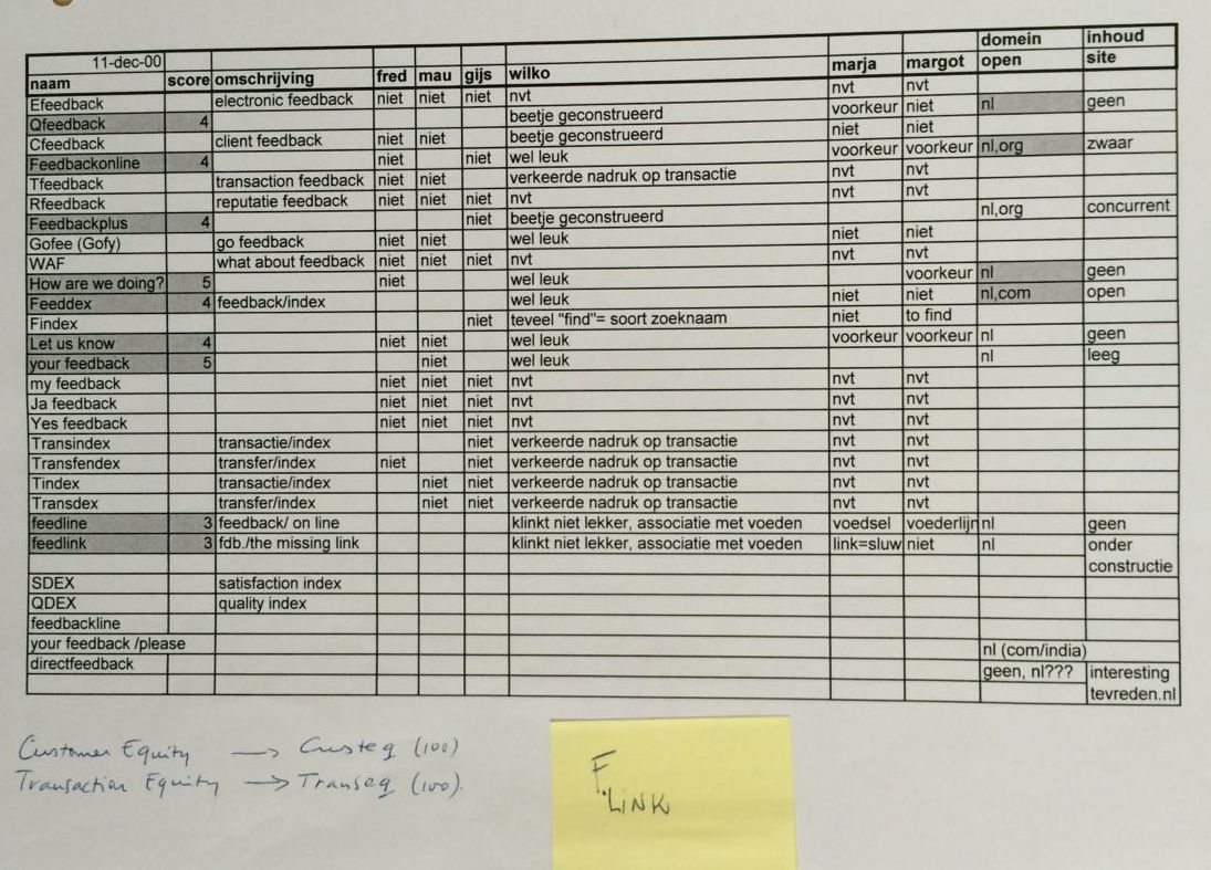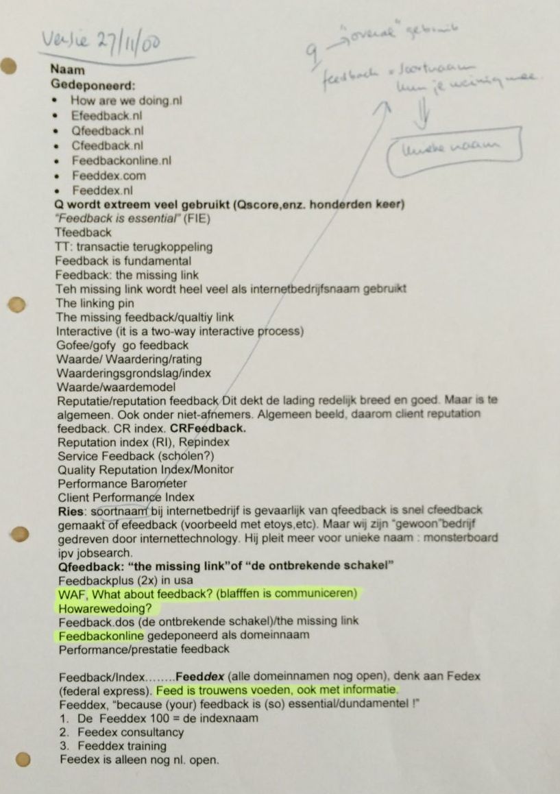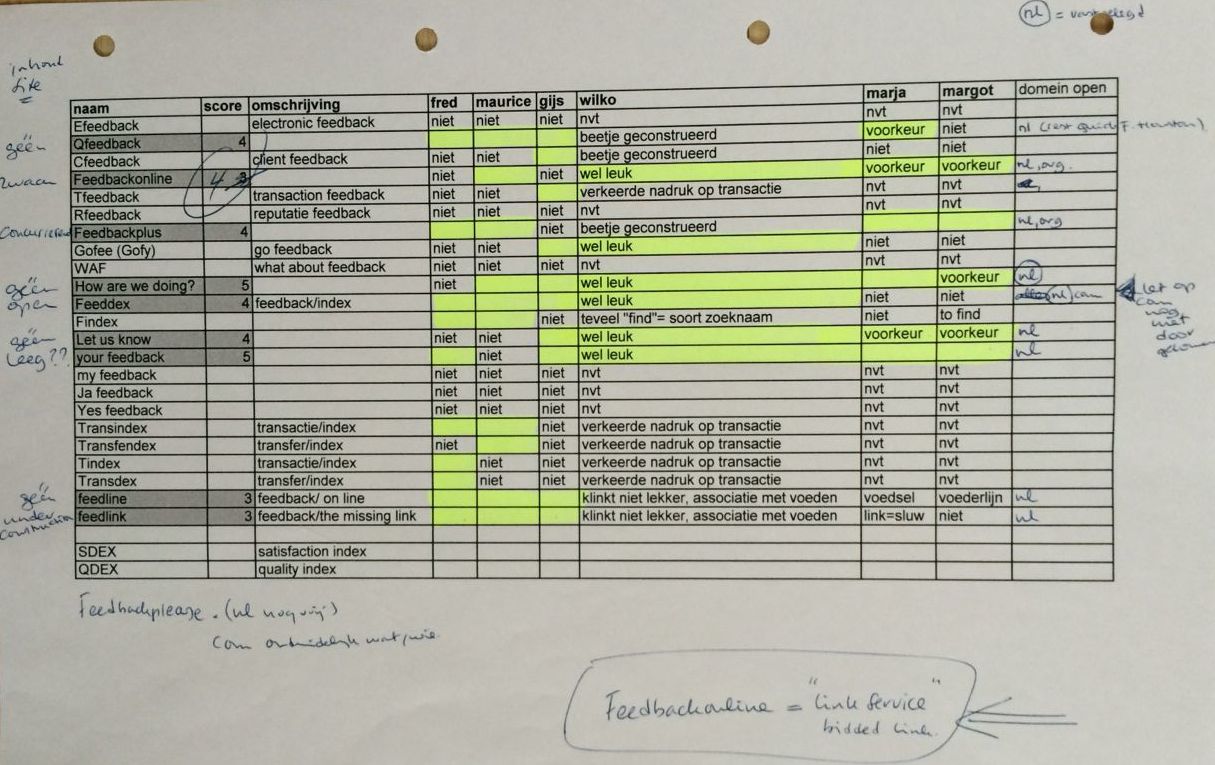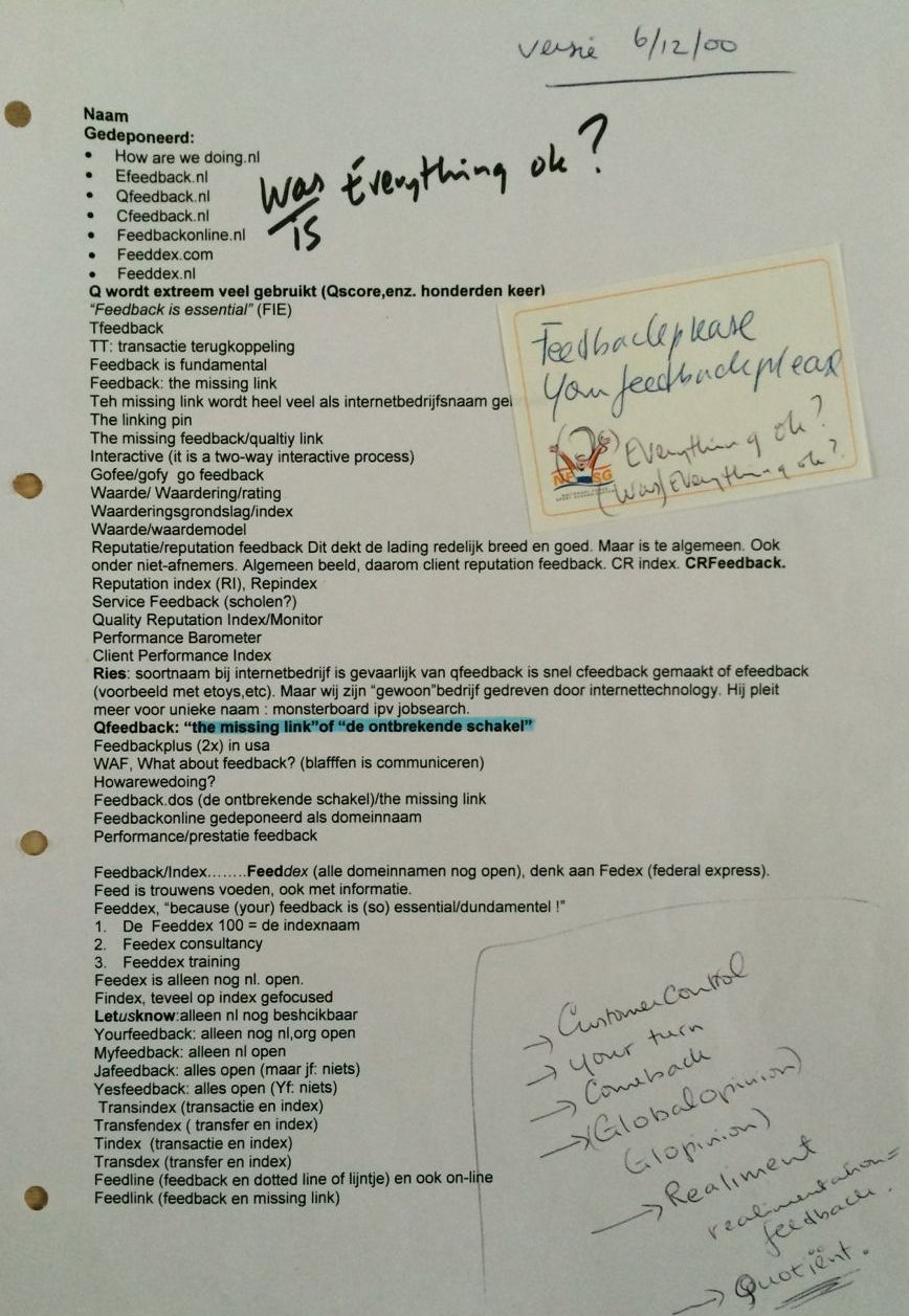In 2000 ging dat vorm krijgen en er volgden brainstormsessies o.a. in de huiskamer met Margot en Marja, over een naam voor het bedrijf, gekoppeld aan het woord 'feedback'.